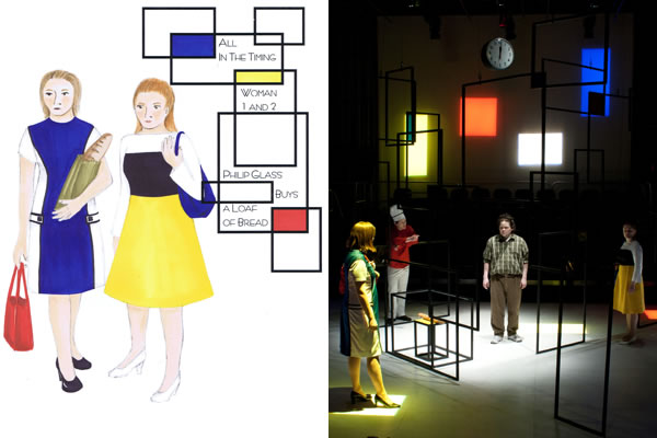 Right: Rendering and production photo for the two women in "Philip Glass Buys a Loaf of Bread." Photo by K. Mendelowitz. Click here for more images.