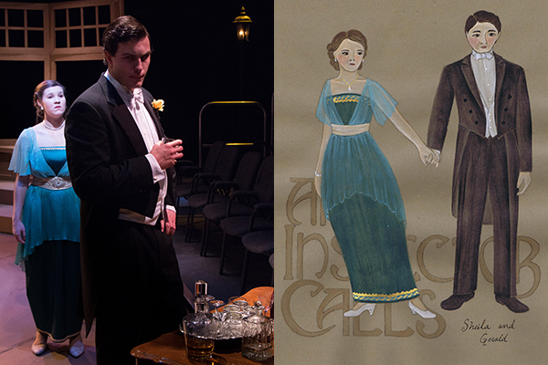 Left: Rendering of Sheila Birling with her finance, Gerald, pictured in a confrontation at the end of Act I. Photos by Kade Mendelowitz. Click here for more images and to see the set design.