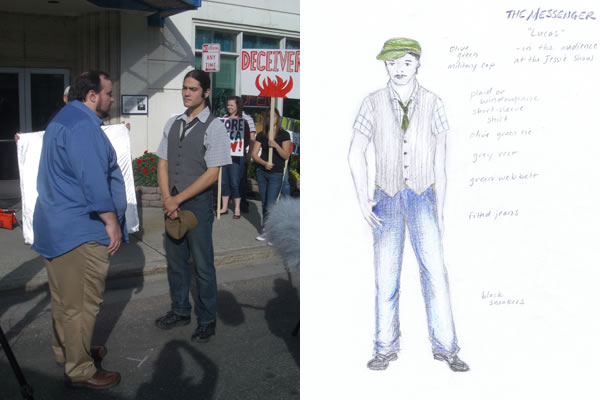 Left: Sketch for Lucas, a protestor, pictured on location with Jeremy, the protest leader. Photo by B. Marx. More images available upon request.