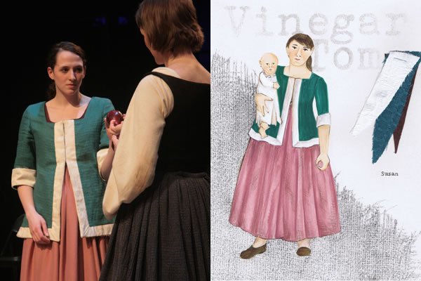 Vinegar Tom alternates dramatic scenes about a 17th Century witch hunt with modern songs commenting on the treatment of women through the ages. Because the production was in-the-round, costumes and props provided most of the context and character information for the audience.
