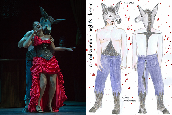 Left: Rendering and production photo of Bottom, transformed, pictured with Titania, Queen of the Fairies. Photos by Steven Koernig. Click here for more images.